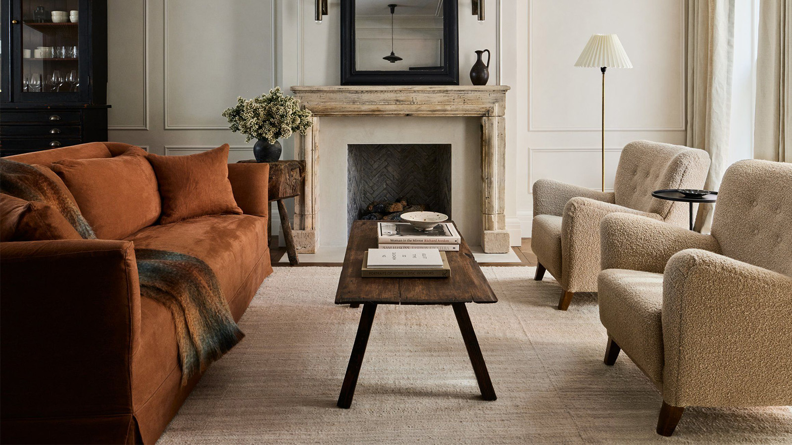 Bouclé sofas, antique brass lighting and marble furniture mix with modern upholstery and abstract artwork in this collection. Shop the style and transform your home with quiet luxury essentials.