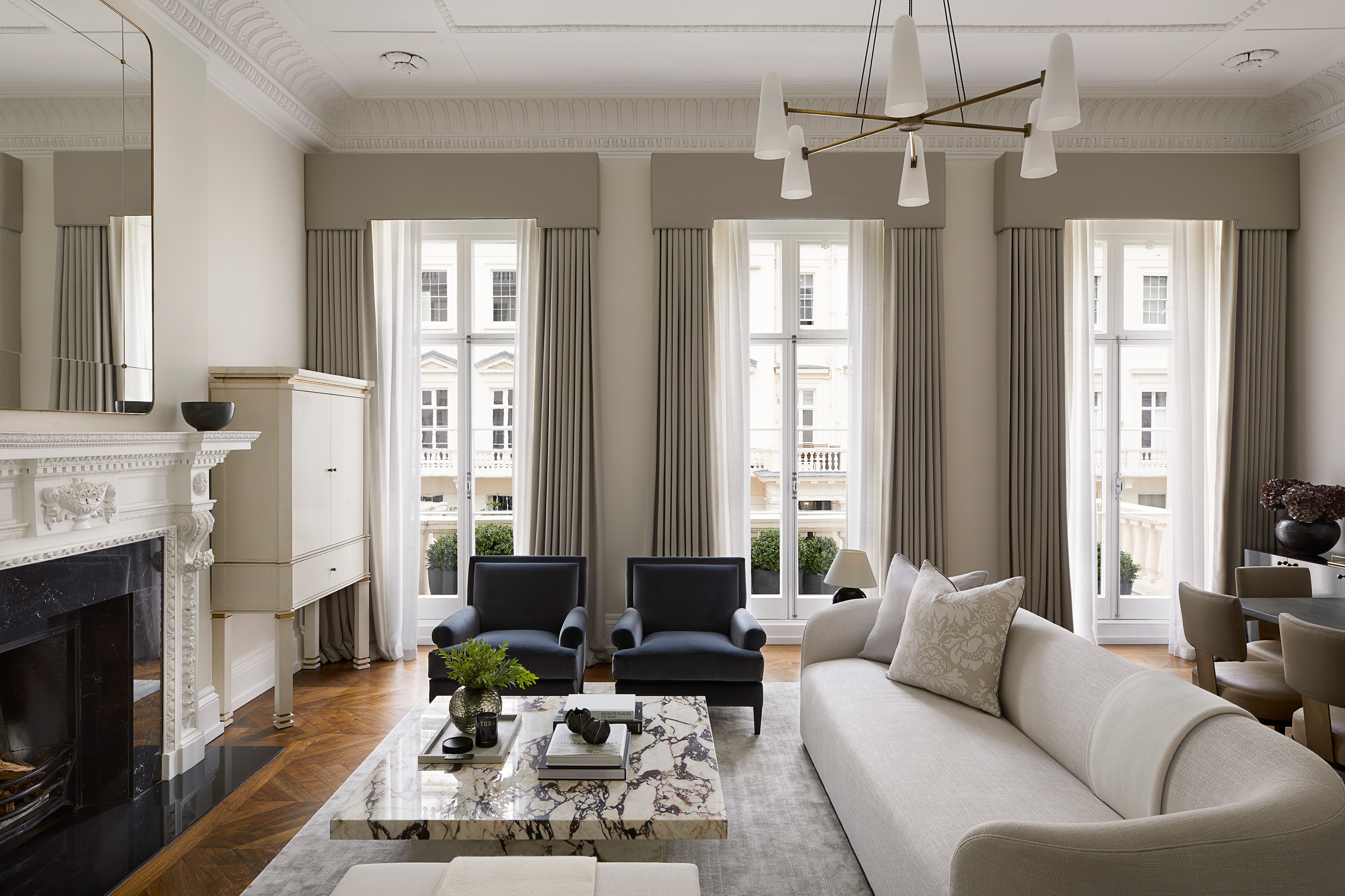 Trio cushion arrangements in opposing corners is a popular and timeless look for a sofa arrangement.
